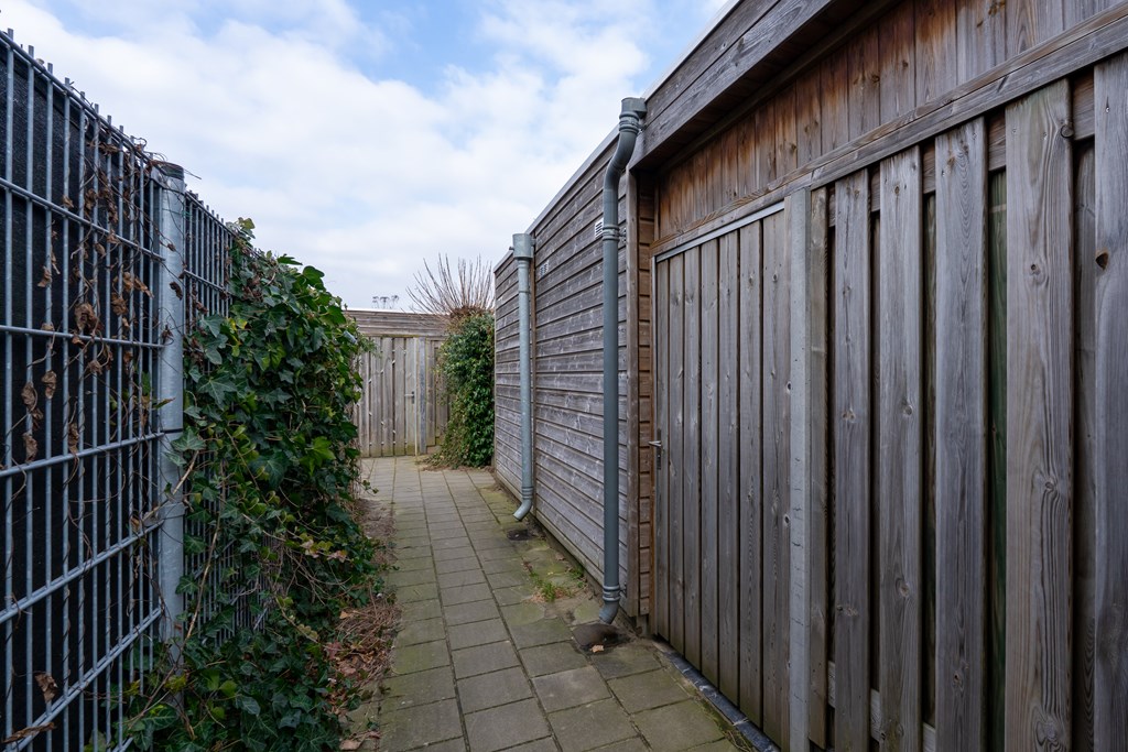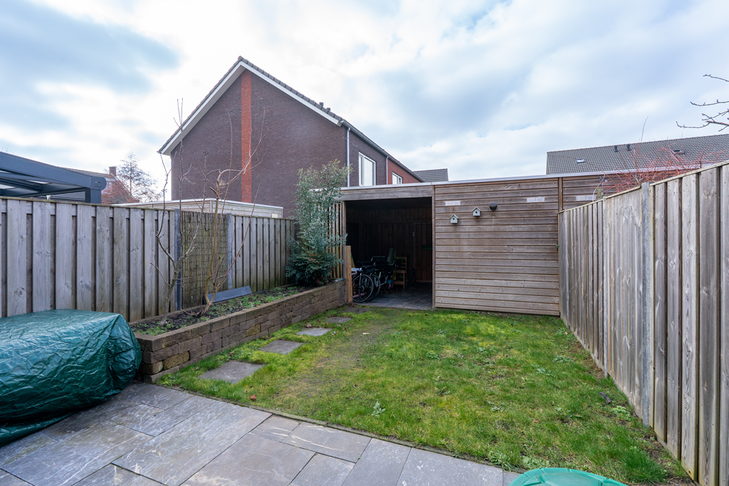 De achtertuin is gelegen op het zuidwesten, zodat je de gehele middag en avond zon hebt. Er is een vrijstaande houten berging met overkapping en achterom. Daarnaast is er een elektrisch zonnescherm om schaduw te creëeren in de warme zomerdagen.