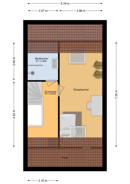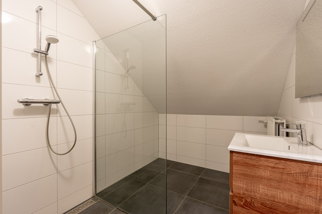 Deze verdieping is erg ruim; een grote slaapkamer met twee dakramen, de tweede badkamer met inloopdouche en wastafel en een grote overloop met wasruimte. Op deze verdieping is het nog mogelijk om een extra slaapkamer te creëeren en wellicht een dakkapel te plaatsen voor meer licht en ruimte.