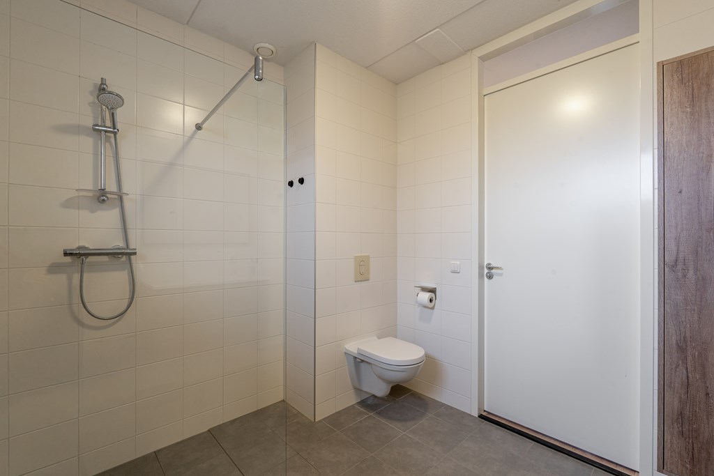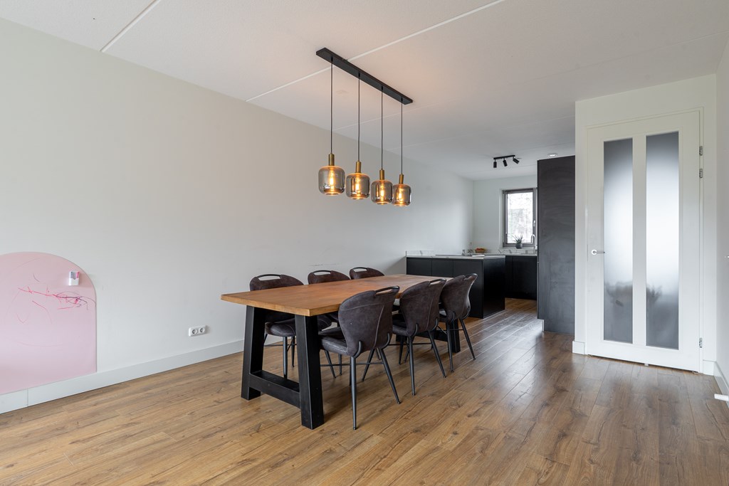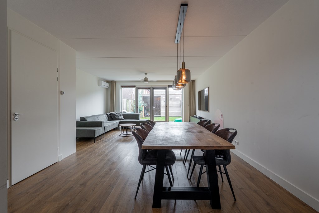 Er is ruimte voor een grote eettafel die in verbinding staat met de woonkamer. Vanwege een uitbouw is de woonkamer zeer ruim, waardoor je qua indeling alle kanten op kunt. De woonkamer is voorzien van vloerverwarming en een airconditioning. Via de openslaande deuren bereik je de achtertuin, daarover later meer!