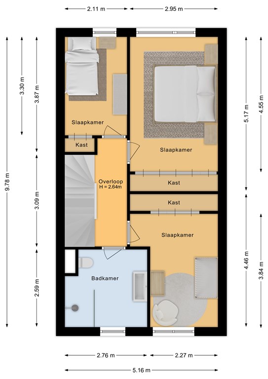 Op deze verdieping vind je drie ruime slaapkamers van circa 15, 10 en 7 m2. Alle slaapkamers zijn voorzien van praktische inbouwkasten. Twee slaapkamers zijn voorzien van een airconditioning. De moderne badkamer heeft een inloopdouche, toilet en wastafel met meubel. Er is tevens een aansluiting voor witgoedapparatuur op de badkamer, maar de huidige bewoners hebben dit op de tweede verdieping geplaatst.