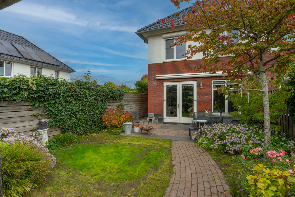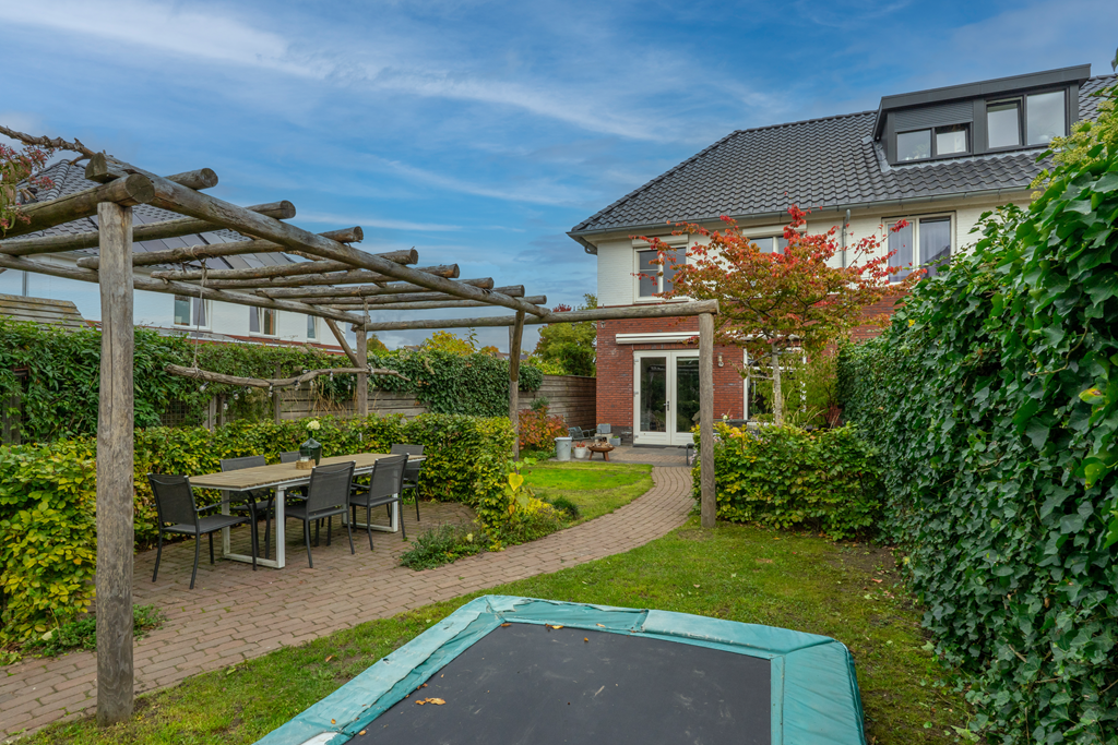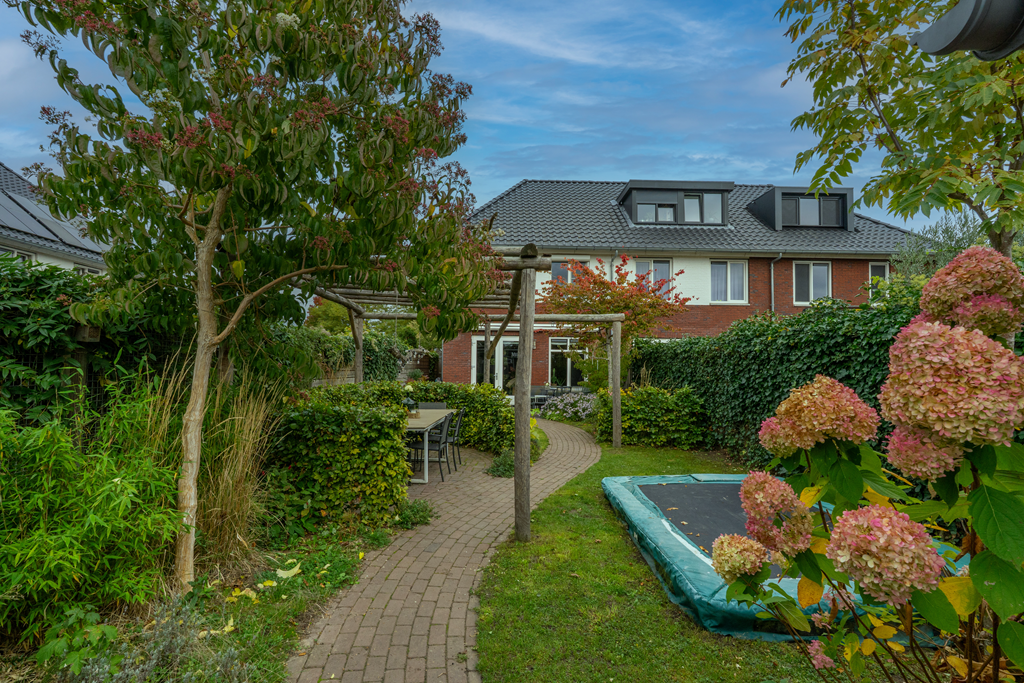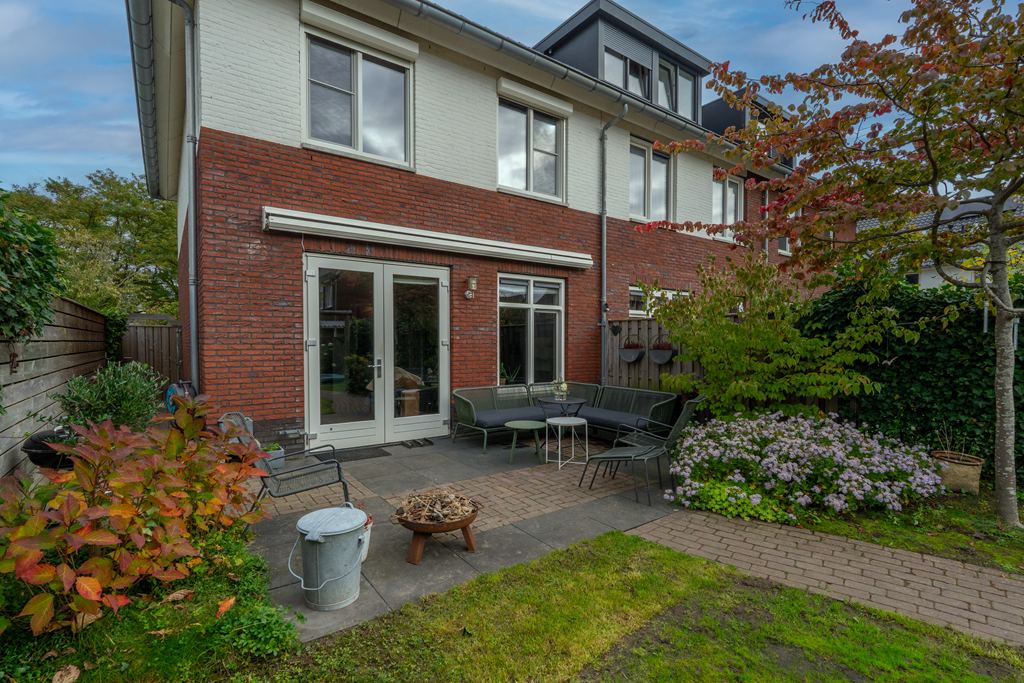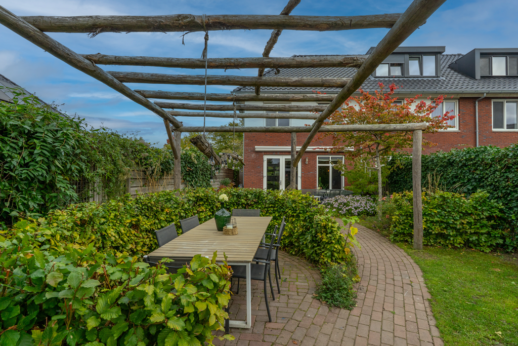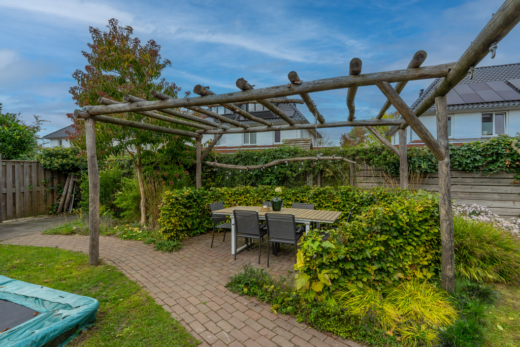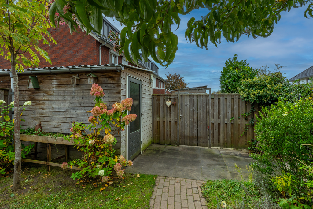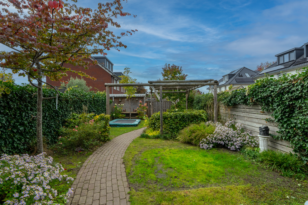 De achtertuin van deze woning is uniek, 20 meter diep met meerdere terrassen en twee poorten. Er zijn de gehele dag zon- of schaduwplekjes te vinden. In de achtertuin is een vrijstaande houten berging met elektra.