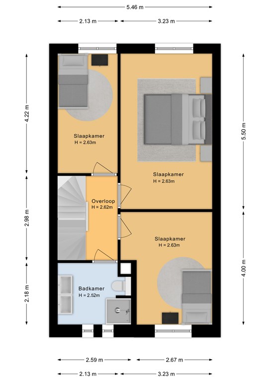 Op deze verdieping vind je drie slaapkamers en een moderne badkamer. De slaapkamers zijn circa 18, 11 en 9 m2 en voorzien van een nette laminaatvloer. De badkamer (2014) is modern ingericht met een inloopdouche, toilet en dubbele wastafel met meubel. De kamers zijn voorzien van rolluiken.