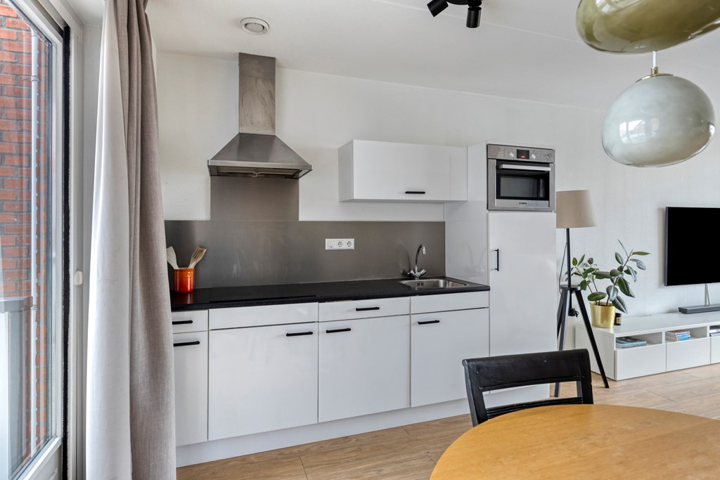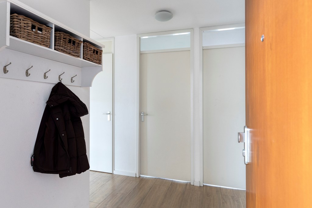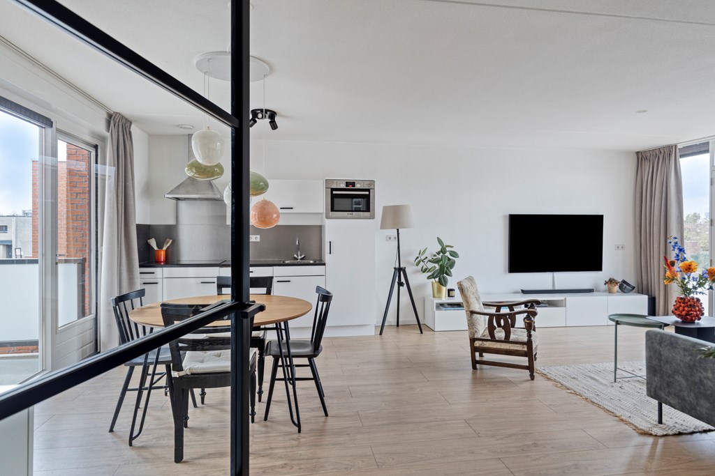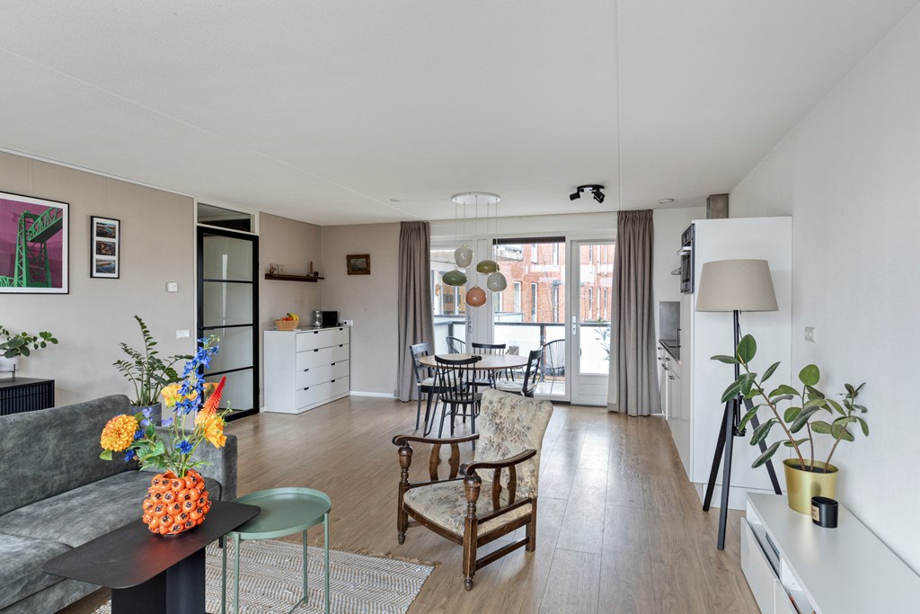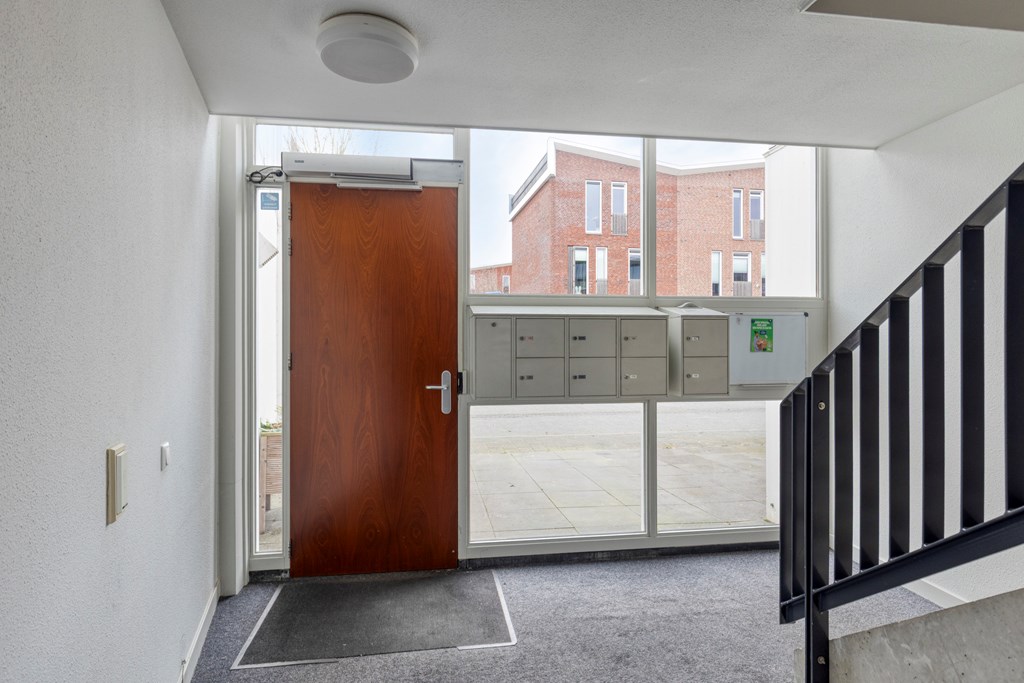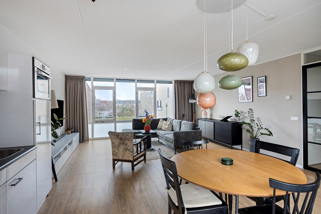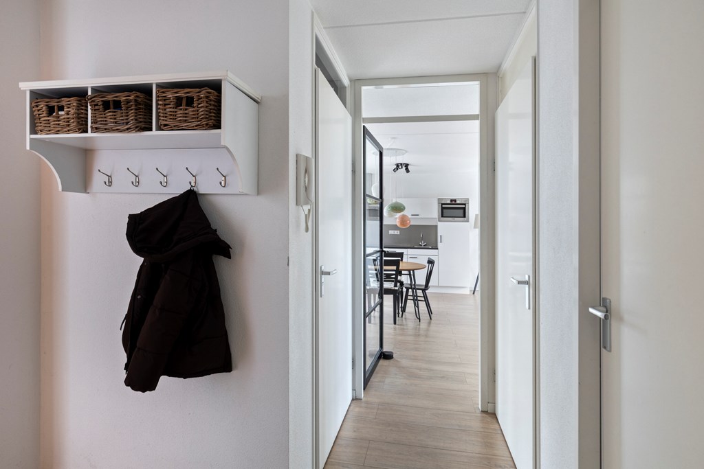 Via de centrale ingang bereik je per trap de eerste verdieping van het complex. In de hal van het appartement heb je de toegang tot de twee slaapkamers, badkamer, toilet en woonkamer met open keuken. De woonkamer heeft veel daglicht door de grote raampartijen aan beide zijden. Er is ruimte voor een fijne zithoek en een grote eettafel bij de keuken. De keuken is voorzien van diverse inbouwapparatuur en vanuit hier heb je ook toegang tot het balkon.