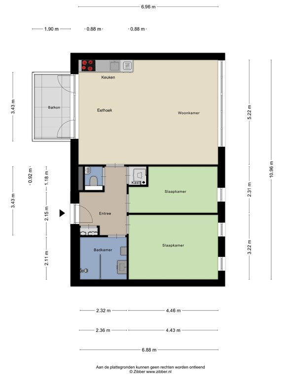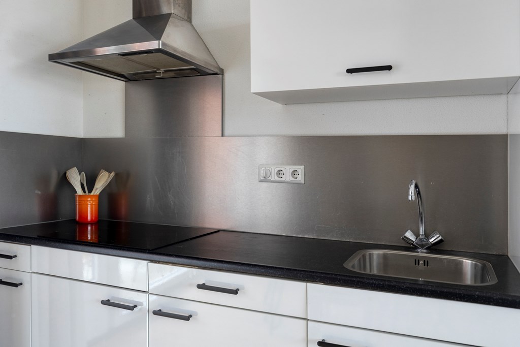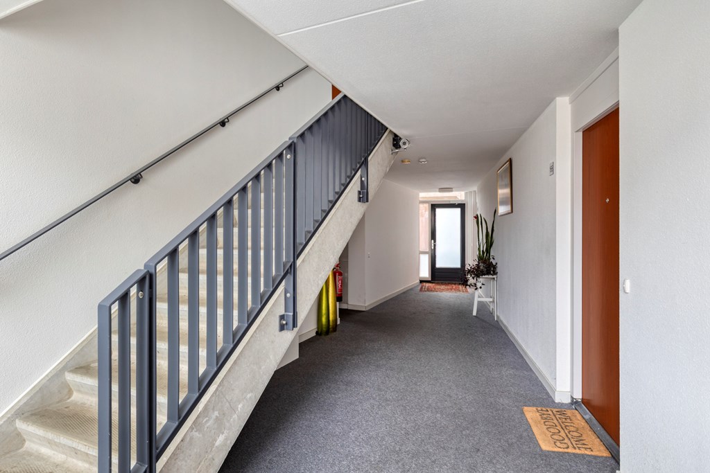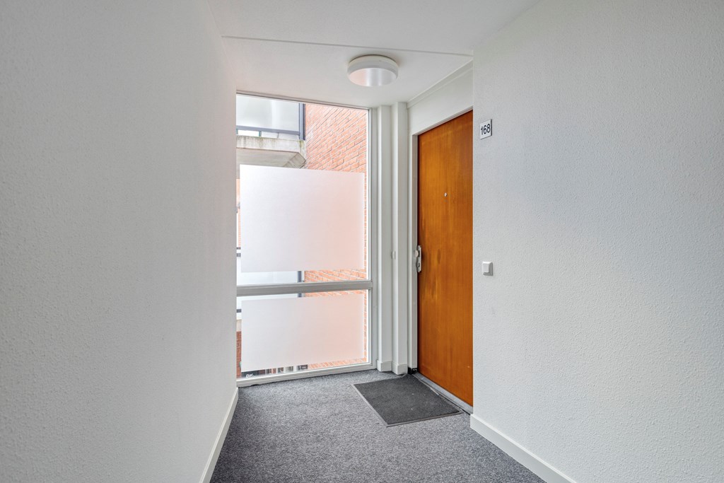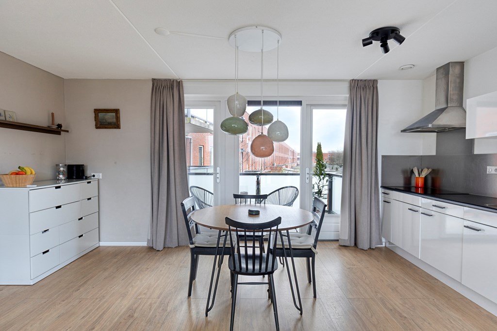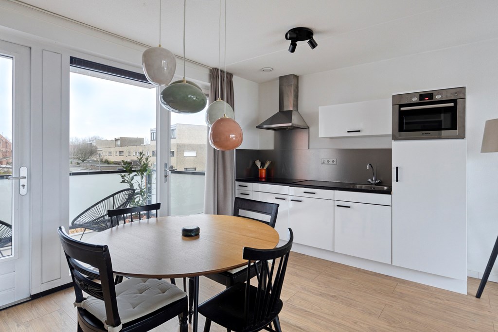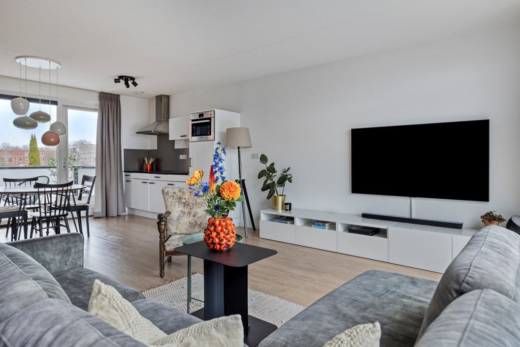 Via de centrale ingang bereik je per trap de eerste verdieping van het complex. In de hal van het appartement heb je de toegang tot de twee slaapkamers, badkamer, toilet en woonkamer met open keuken. De woonkamer heeft veel daglicht door de grote raampartijen aan beide zijden. Er is ruimte voor een fijne zithoek en een grote eettafel bij de keuken. De keuken is voorzien van diverse inbouwapparatuur en vanuit hier heb je ook toegang tot het balkon.
