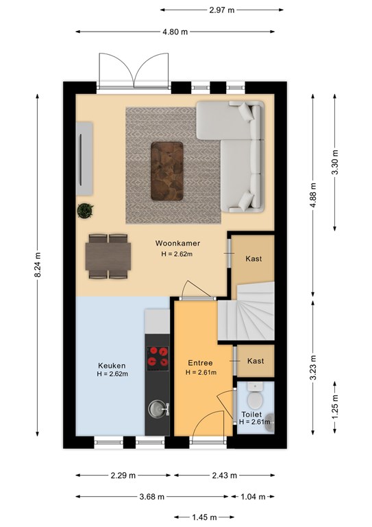 De woning heeft een praktische indeling. Bij binnenkomst is er een hal met toilet en meterkast. Vanuit de hal stap je in de lichte woonkamer met een open keuken aan de voorzijde. De woonkamer biedt ruimte voor zowel een zithoek als een eettafel, met openslaande deuren naar de achtertuin. Een trapkast zorgt voor extra bergruimte.
