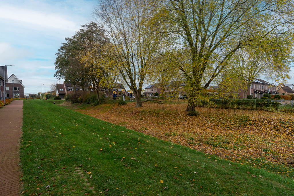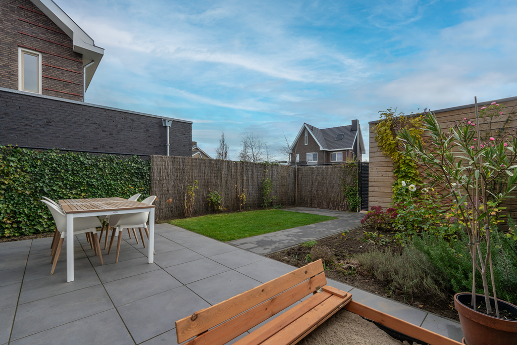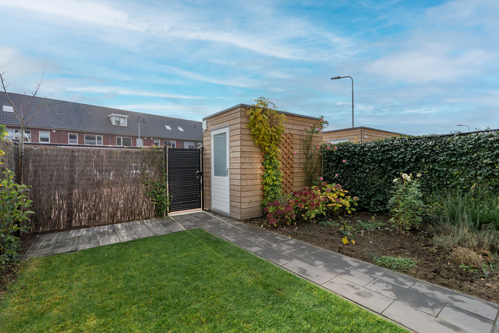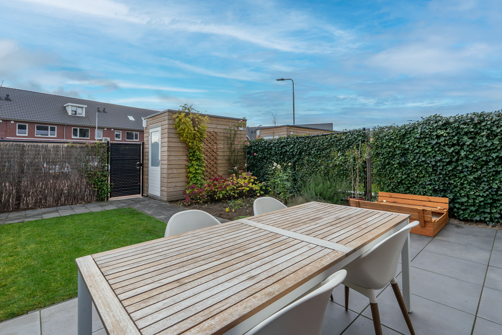 Door de ligging op de hoek heb je een voor-, zij- en achtertuin. Daardoor heb je een achterom vanaf de algemene parkeerplaats, maar ook een achterom op eigen perceel. De achtertuin is gelegen op het zuid-oosten en daardoor de gehele dag veel zon. De huidige eigenaren hebben een elektrisch zonnescherm geplaatst voor de warme dagen. Daarnaast is er nog een vrijstaande houten berging voor opslag.