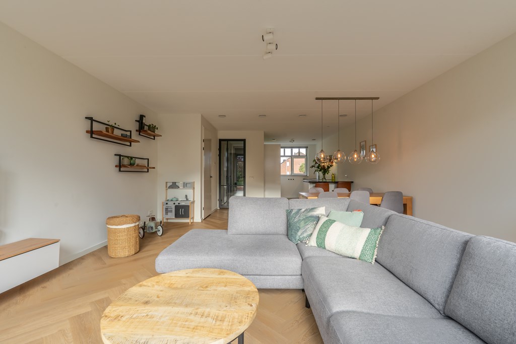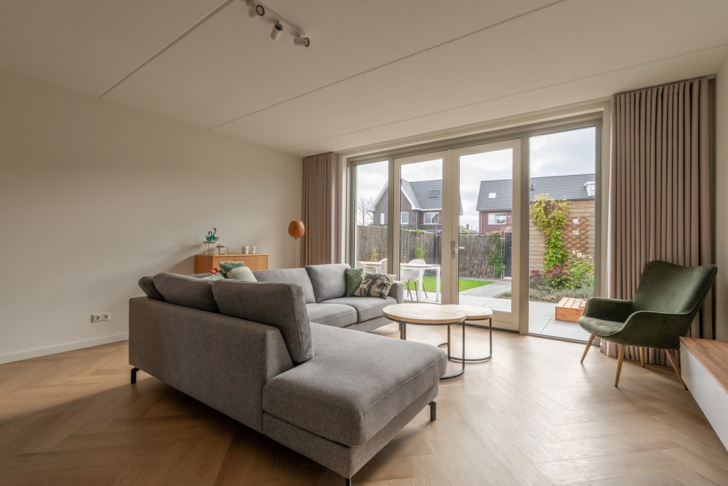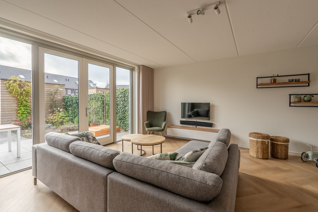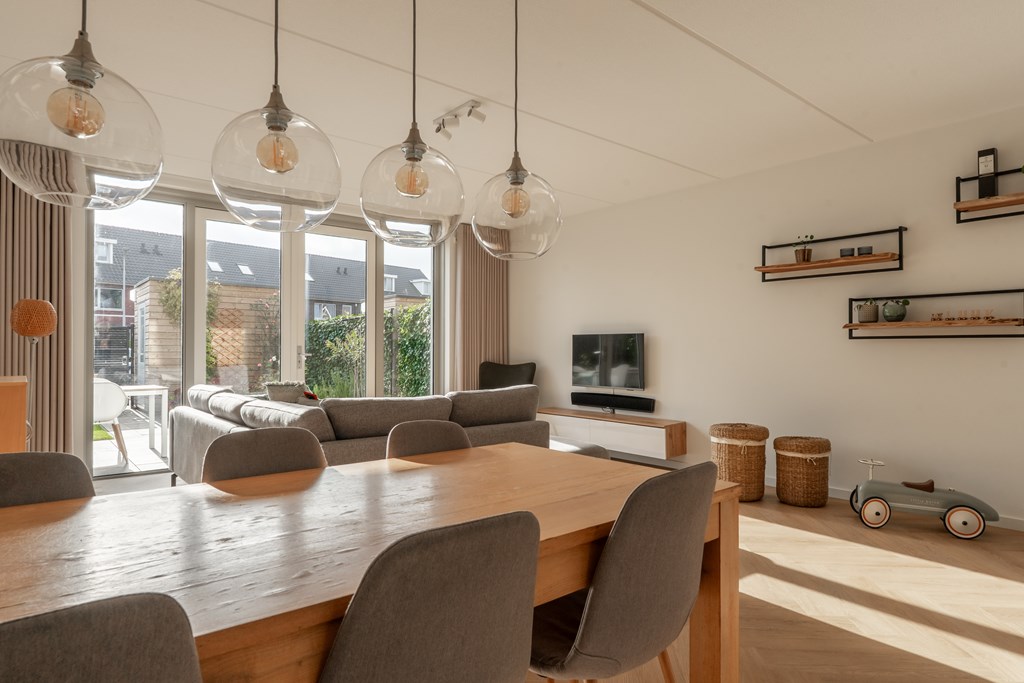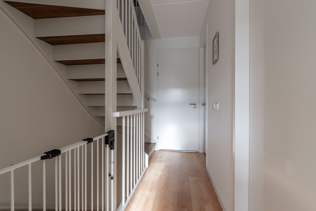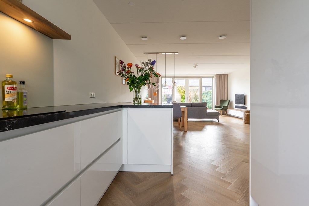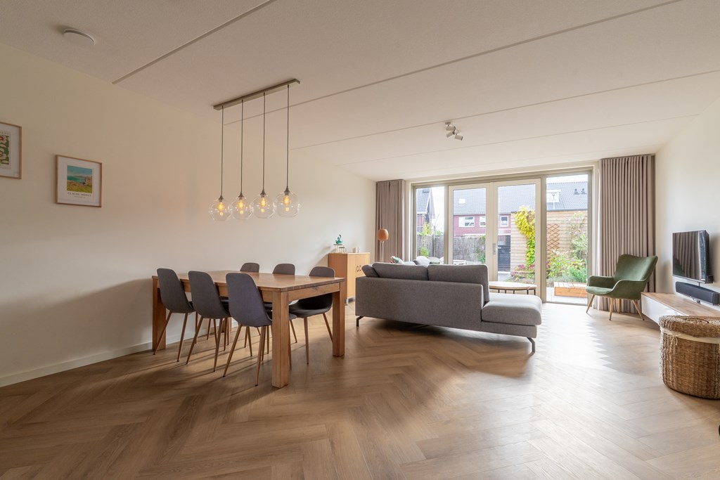 Parkeren doe je aan de achterzijde van de woning. Aan de voorzijde ligt de woning aan de groenstrook met speeltuin. Hierdoor is het rustig gelegen, ideaal voor gezinnen met kinderen. Via de voordeur bereik je de hal van de begane grond die direct de sfeer van de woning uitstraalt; modern, ruim en open. In de hal heb je toegang tot de technische ruimte met elektrische boiler, toilet met fonteintje, trapopgang naar de 1e verdieping en doorgang naar de woonkamer. Hier valt direct de ruimte op; een grote zithoek, ruimte voor een grote eettafel en een moderne open keuken aan de voorzijde van de woning. De gehele begane grond is voorzien van vloerverwarming met een pvc-visgraatvloer. De keuken is voorzien van diverse inbouwapparatuur met uitzicht op het parkje aan de voorzijde. Aan de achterzijde zijn er openslaande deuren richting de achtertuin, daarover later meer!