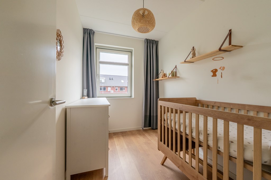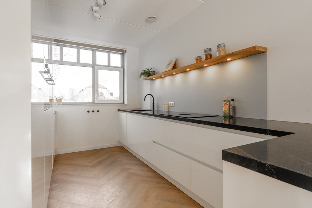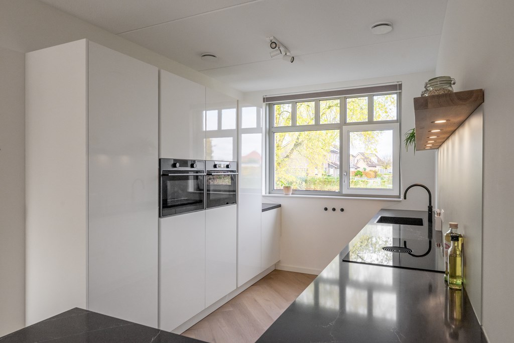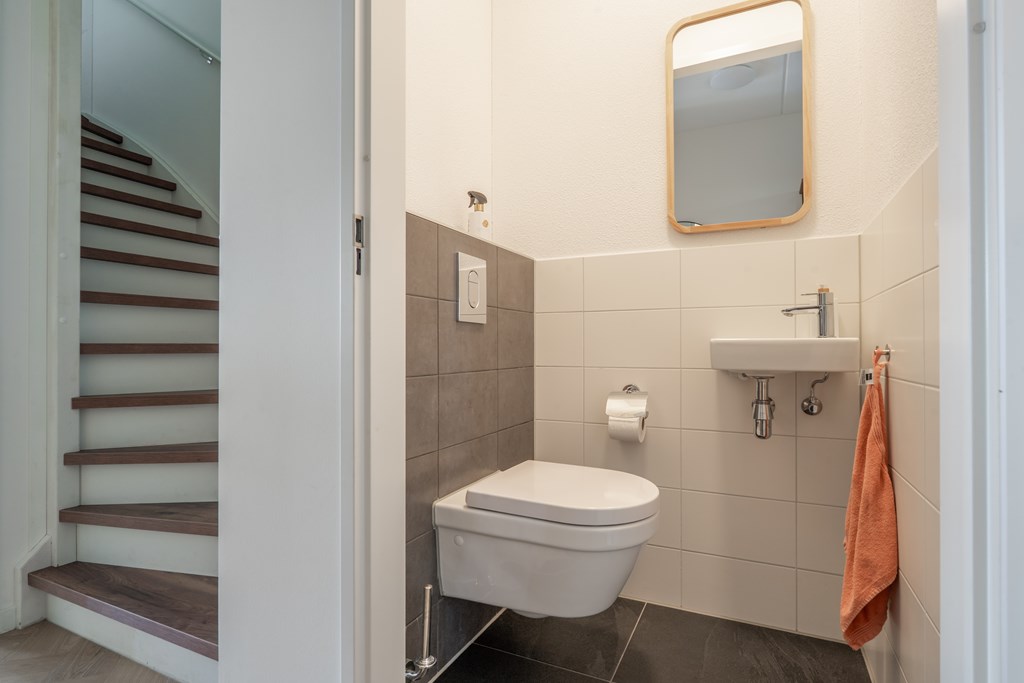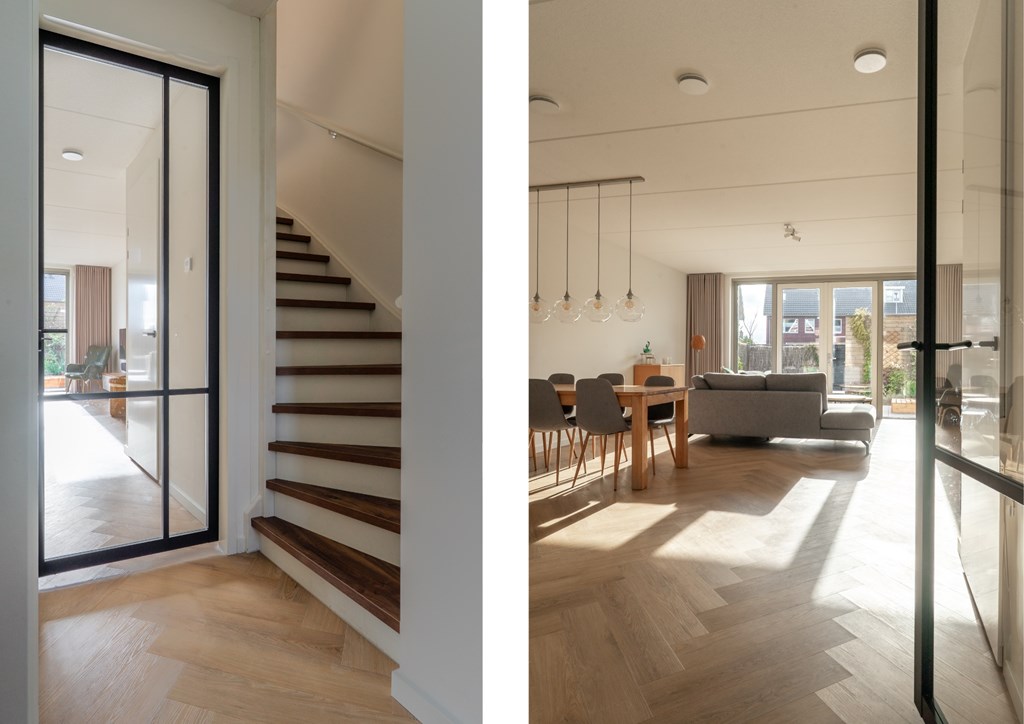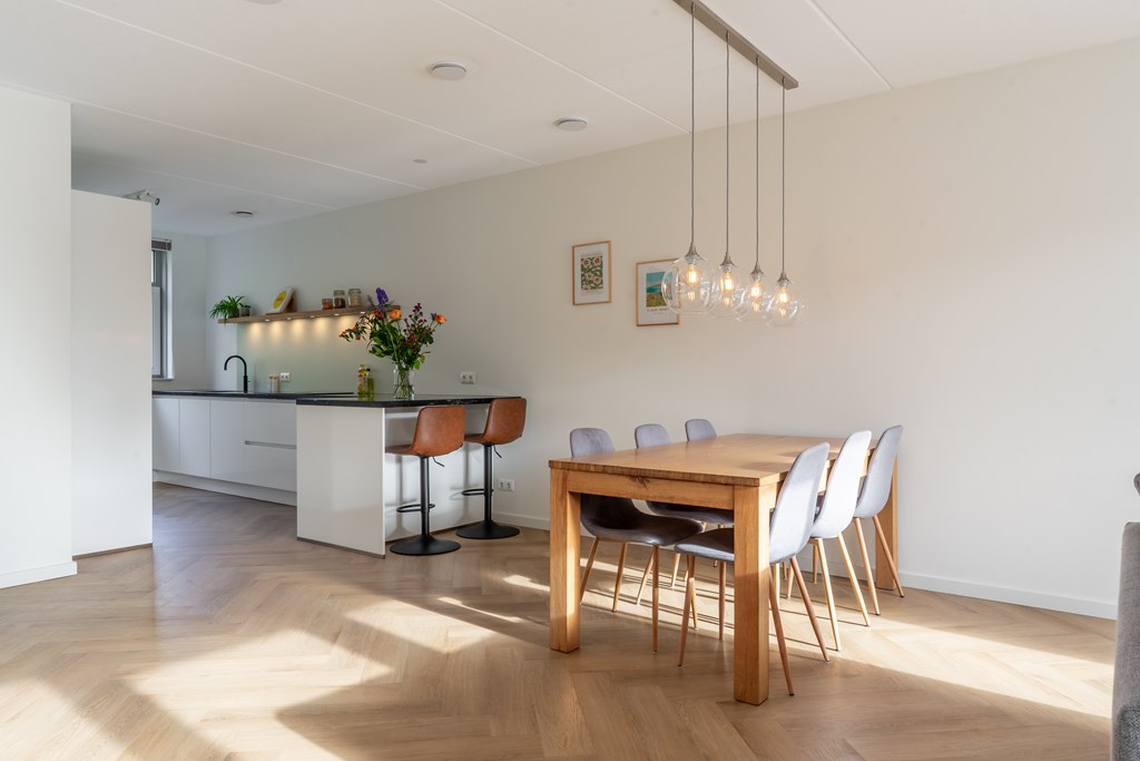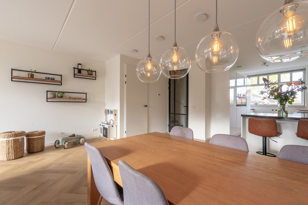 Parkeren doe je aan de achterzijde van de woning. Aan de voorzijde ligt de woning aan de groenstrook met speeltuin. Hierdoor is het rustig gelegen, ideaal voor gezinnen met kinderen. Via de voordeur bereik je de hal van de begane grond die direct de sfeer van de woning uitstraalt; modern, ruim en open. In de hal heb je toegang tot de technische ruimte met elektrische boiler, toilet met fonteintje, trapopgang naar de 1e verdieping en doorgang naar de woonkamer. Hier valt direct de ruimte op; een grote zithoek, ruimte voor een grote eettafel en een moderne open keuken aan de voorzijde van de woning. De gehele begane grond is voorzien van vloerverwarming met een pvc-visgraatvloer. De keuken is voorzien van diverse inbouwapparatuur met uitzicht op het parkje aan de voorzijde. Aan de achterzijde zijn er openslaande deuren richting de achtertuin, daarover later meer!